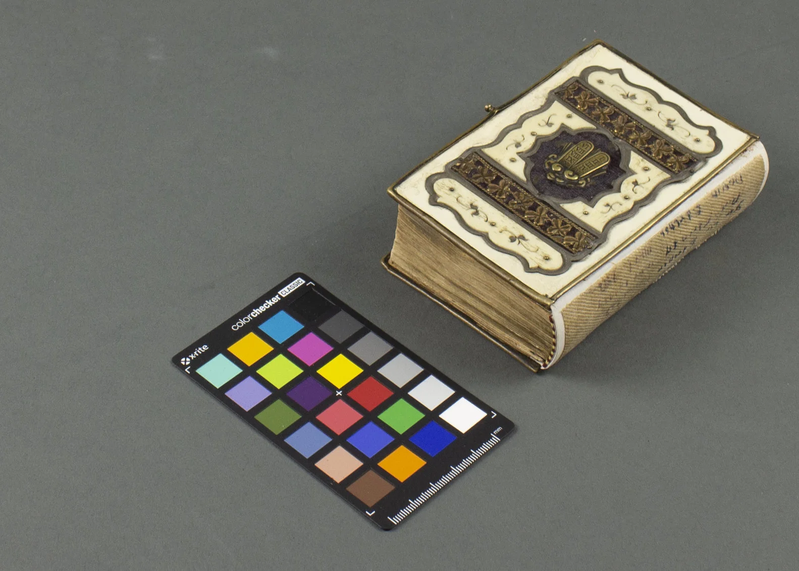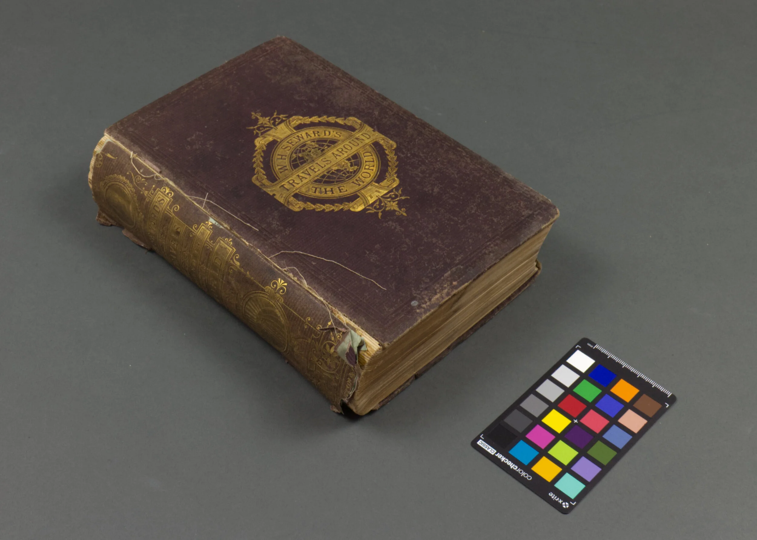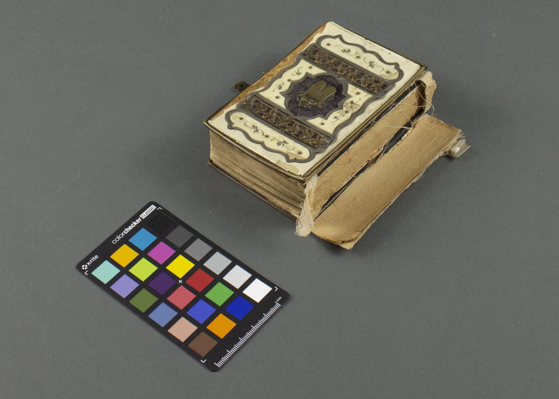 The spine and both covers were fully separated from the text. The brass frame around both boards was distorted and the covering material on both boards was chipped and had losses. These losses were filled with sympathetically toned Japanese paper. The brass frames were reshaped to fit back onto the boards. A reback was completed with cotton cloth to mimic the original and then the original spine was adhered back into place.