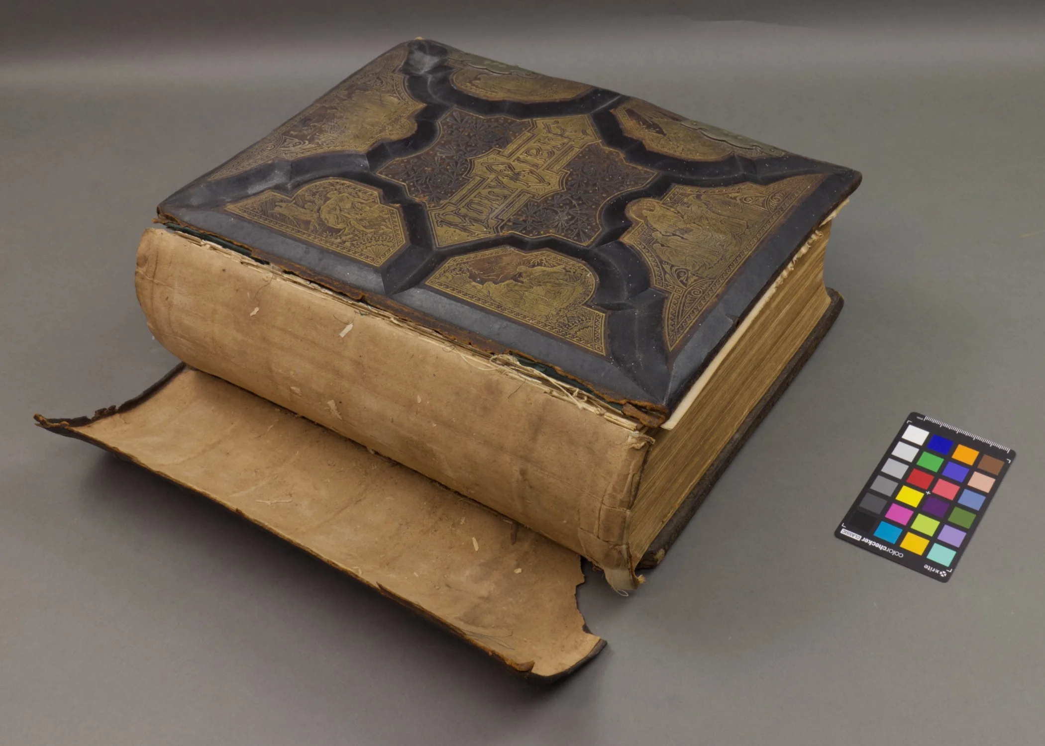 Repairing books, whether it is a 16th century text or a 20th century Bible, is always a unique process. This can include but is not limited to cleaning, tear mending, tape removal, reattaching covers, new covers, new spines, or stamping. All with the goal of improving the access and usability of these items.