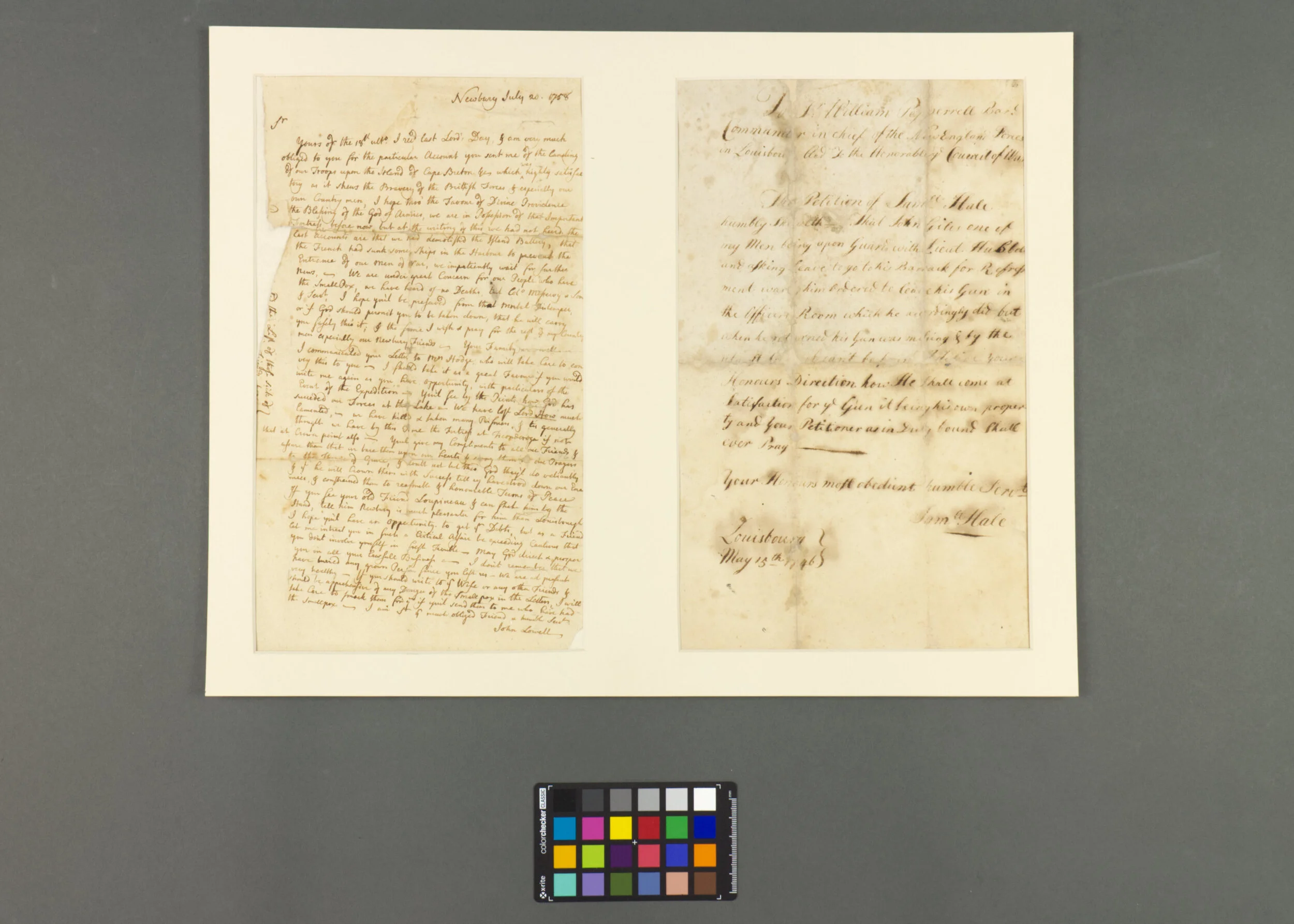 This document came in with prior repairs and a large loss on the left side. The previous lining was reattached where delaminated and a toned fill was put into place before the letter was matted with another document.